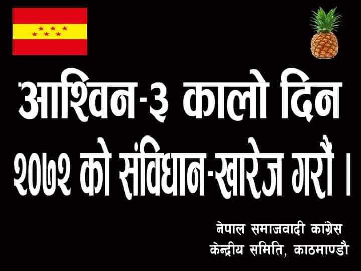 काठमाडौं, असोज ३ । सरकारले सर्वसाधरणलाई धुमधामका साथ संविधान दिवस मनाउन आग्रह गरिरहेका बेला निर्वाचन आयोगमा दर्ता भएको नेपाल समाजवादी कांग्रेसले भनें संविधानको विरोधमा प्रदर्शन गरेको छ ।